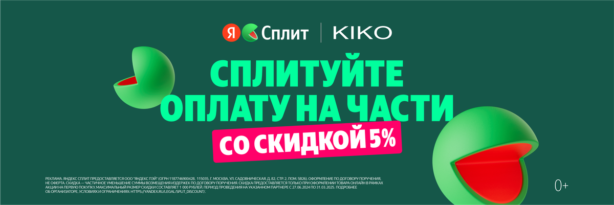 А поскольку бьюти-шопинг иногда не может ждать зарплаты, вам точно пригодится Яндекс Сплит. Сервис позволяет разделить стоимость покупок на несколько частей. Работает просто: выбираете способ оплаты Сплит при покупке на сайте Kiko Milano, вносите первый платёж, а остальную сумму удобно делите на части. Причём сразу видите даты будущих списаний — никаких сюрпризов.